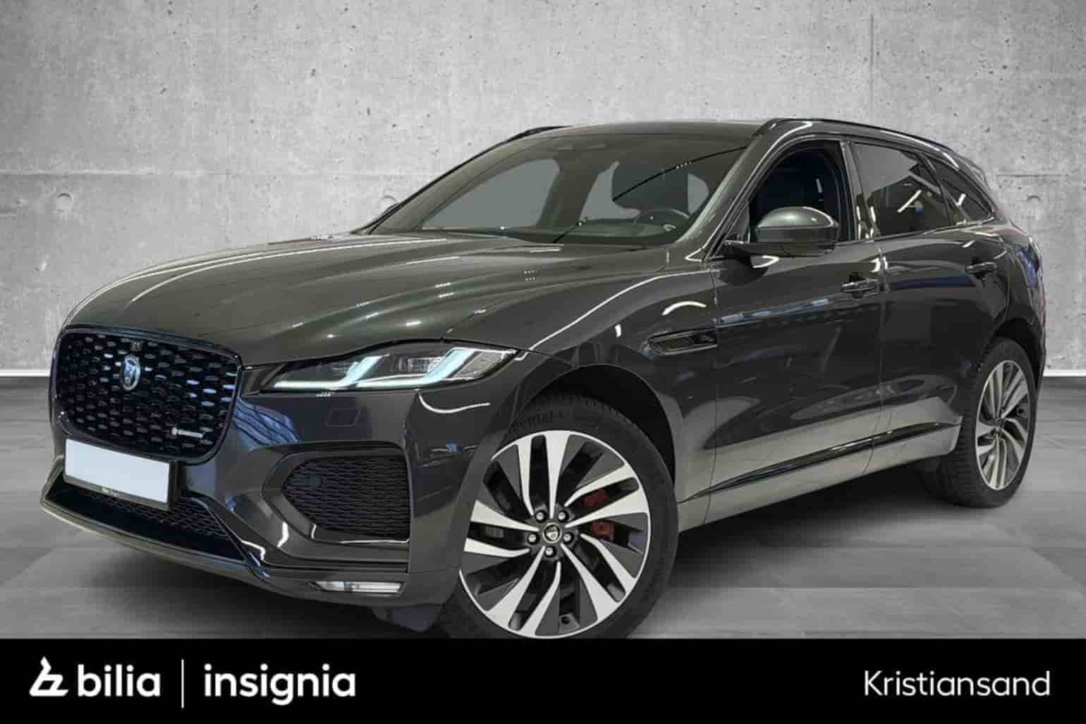 2021 Jaguar F-Pace P400e ladbar hybrid med 404 hk, firehjulstrekk og automatgir i fargen Storm Grey. Bilen kombinerer kraftfull drivlinje med komfortabel kjøreopplevelse og presis styring. R-Dynamic gir sportslig design og høy materialkvalitet med skinninteriør og moderne førermiljø. Leveres med sommer- og vinterhjul.