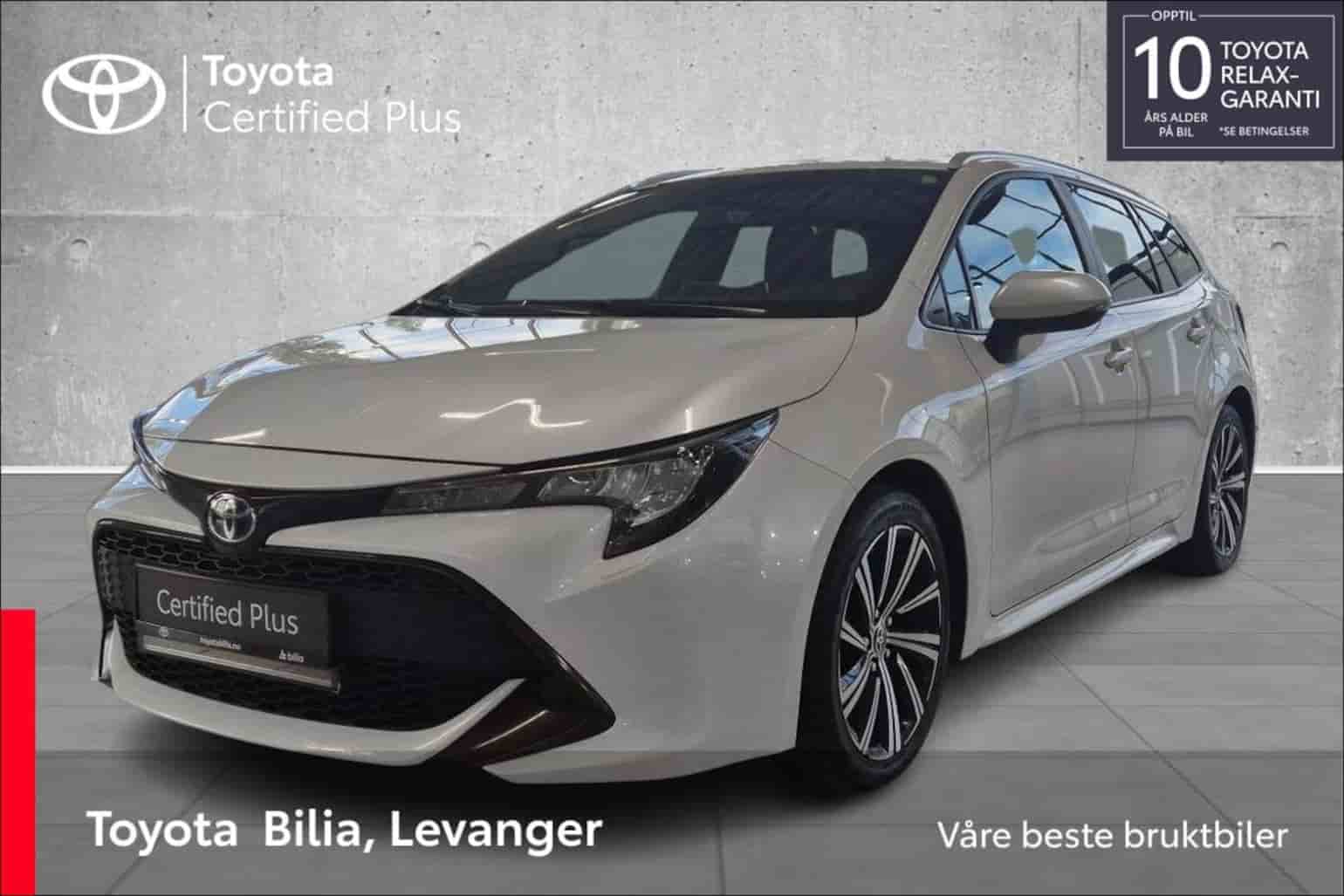 Pen og godt vedlikeholdt Corolla hybrid i hvit står klar i butikken for hurtig levering.