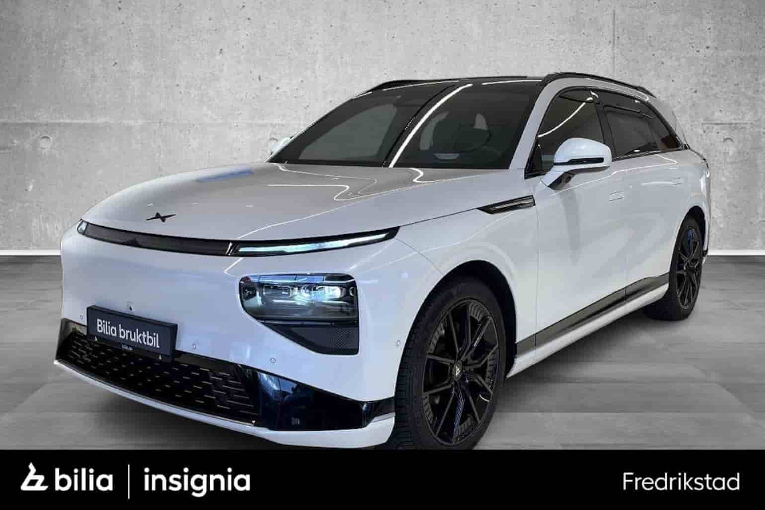2024 Xpeng G9 Long Range med Firehulstrekk. Nydelig kombinasjon av hvit metallic eksteriør med svart skinninteriør.