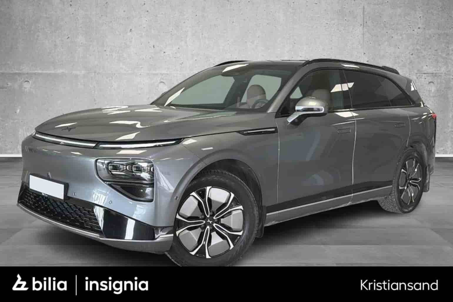 2023 Xpeng G9 med to elmotorer, firehjulstrekk og grå metallic lakk. Stor og komfortabel SUV med luftfjæring, moderne assistentsystemer og ryddig infotainment. Lader med inntil 300 kW DC, som under gode forhold kan gi 10–80 % på omtrent 20 minutter. Elektrisk utfellbart hengerfeste på 1 500. WLTP rekkevidde på hele 520 kilometer.